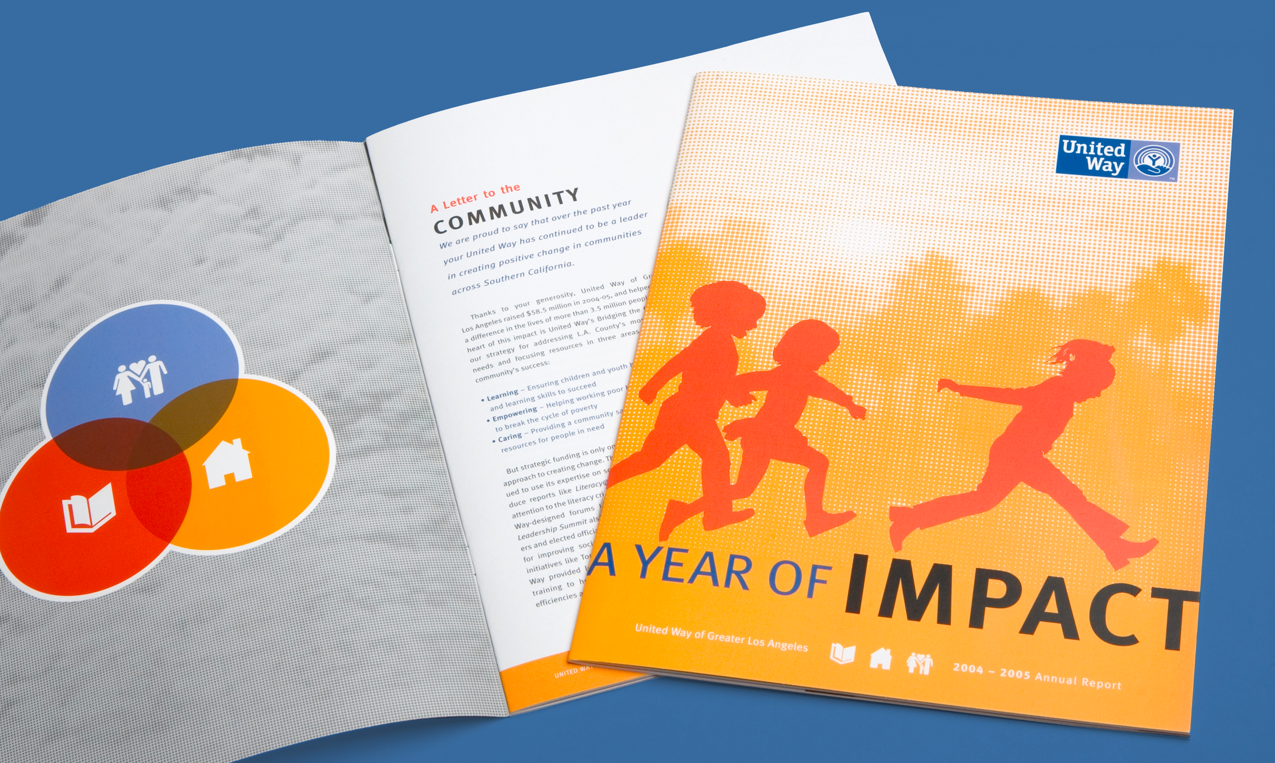 I had the honor of designing several printed publications for United Way LA, but I am particularly proud of the design for the 2004-2005 Annual Report. The level of work involved—from cover and theme concepts, to rounds of layout design, to fact-checking, grammar-checking, print setup, and proof-checking at the printer—requires every muscle of skill and creativity, to not only produce something without flaws, but that meets the needs and requirements of several key stakeholders.